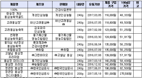 조사대상 제품 중 천지양 고려홍삼정골드(제조원: 대동고려삼(주), 판매원:(주)천지양)가 100g당 37,083원으로 가장 저렴하고, 정관장 홍삼정 마스터클래스(제조원:(주)한국인삼공사)가 100g당 275,500원으로 가장 비쌌다.