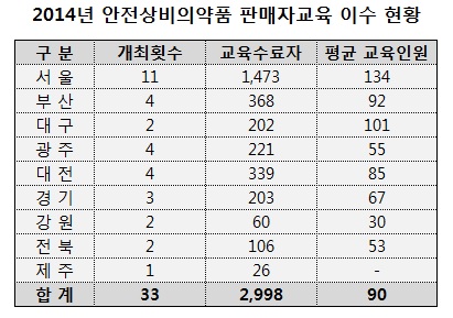 약사회 집계에 따르면 2014년 1월부터 12월까지 1년동안 안전상비의약품 판매자 교육을 이수한 사람은 모두 2,998명으로 집계됐다.