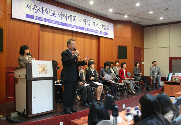 ▲ 재학생 진로설명회 지난 2010년 4월 제1회 ‘재학생 진로설명회’를 서울대학교 약대 강당에서 개최했다. 졸업을 앞두고 앞으로의 진로와 취업에 대해 고민하는 후배들을 위해 여동문회에서 기획하여 각 분야의 선배 강사들을 섭외하여 진행했다. 재학생 후배들의 뜨거운 관심 속에 끊임없이 질문이 이어졌고 설명회를 마치고도 선후배가 모여 진지한 대화가 이어질 정도로 큰 호응이 있었다. 강사로서 참여한 동문들은 재학생 후배들의 진지한 관심에 작은 도움을 주는 계기가 마련되었다며 자긍심이 느껴지고 계속 참여하고 싶다는 의견을 남겼다.