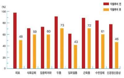 그리고 1명은 본 약물 투여와는 상관없는 증상 때문에 중단 하였으며, 대조군의 경우 14명이 임의로 투여를 중단하였고, 3명은 두드러기로, 2명은 몸이 부어서, 1명은 가슴이 뛰는 증상 때문에 중단하였다. 나머지 205명은 특이할 만한 부작용 없이 전 과정을 수행하였다.