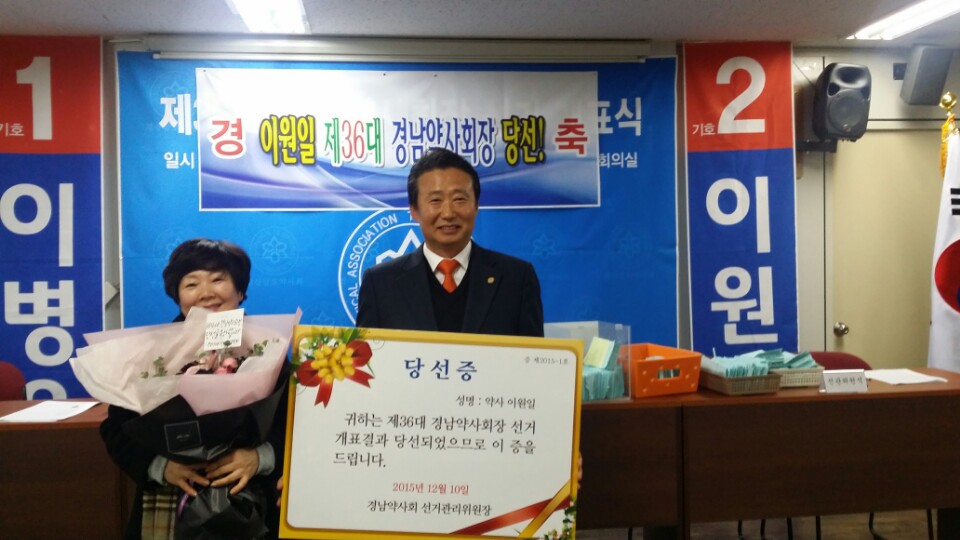 경상남도 약사회장선거 총 유권자 1656명 중 1191명 투표로 투표율 71.9% 기록하고, 기호 1번 이병윤후보 544표, 기호2번 이원일 628표 얻어 84표 차이로 이원일 현회장이 당선됐다.