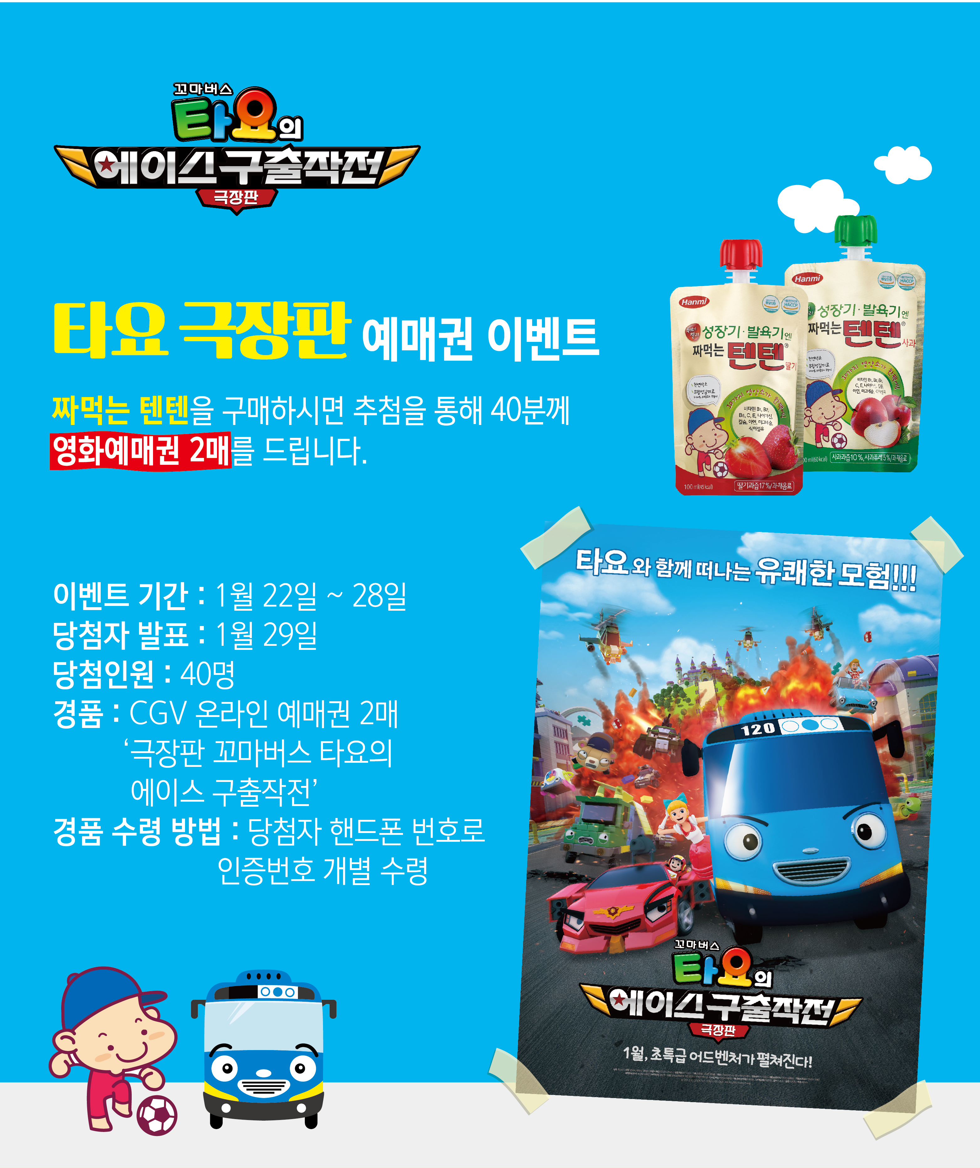 오는 1월 31일까지 진행되는 이번 이벤트는 짜먹는 텐텐을 티몬에서 구입한 구매고객 중 40명을 추첨해 극장판 꼬마버스 타요 예매권을 2매씩 증정하는 방식으로 진행된다.
