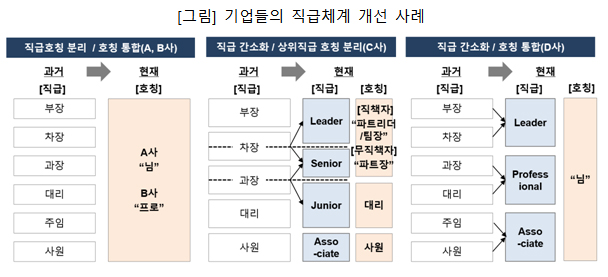 그 와중에 60세 정년법제화에 따라 내부 인력들의 고령화가 예견된다. 직급 단순화가 목적하는 바는 분명하다. 수평적으로 조직문화를 바꾸고 업무 효율성을 높이겠다는 것이다. 몇 개 기업의 직급체계 개선 사례를 보자.