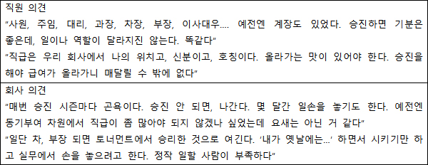 위에서 나온 목소리처럼, 직원들은 “주임에서 대리로 승진했는데, 일이 달라진 게 없다”라든가, 회사에서는 “일이 달라진 게 없는데, 승진으로 인해 인건비만 상승했다”라는 식의 불만이 계속 나오기 때문이다.