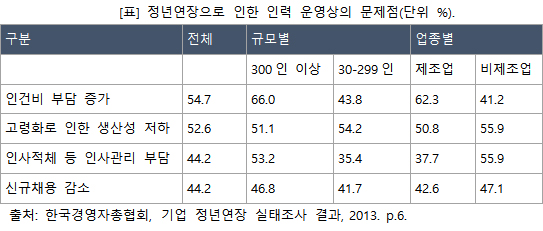 2013년 한국경영자총협회가 실시한 기업 정년연장 실태조사 결과는 이러한 기업의 우려를 잘 보여준다. 특히 제약업은 매출액 대비 인건비 비중이 제조업 평균보다 2배 정도 높아, 정년 연장에 따른 인건비 부담이 더 커질 것으로 보인다.
