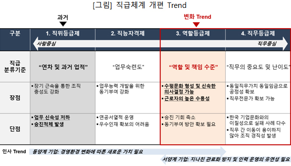 그 동안 한국기업에서 대부분 사용해 온 사원-대리-과장-차장-부장의 직급체계는 ‘직위등급제’라고 일컬어 왔다. 그러나 직위등급제가 연공서열 위주로 운영이 되면서(물론 그렇지 않은 곳도 있지만) 인건비 부담을 가중시키는 원인이 된다고 지적받고 있다.
