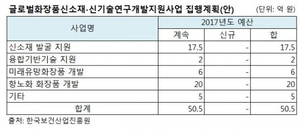 한국보건산업진흥원(원장 이영찬)이 '2017년 글로벌화장품신소재 및 신기술연구개발지원사업'에 50억 5천만원의 예산을 지원할 계획이라고 밝혔다.