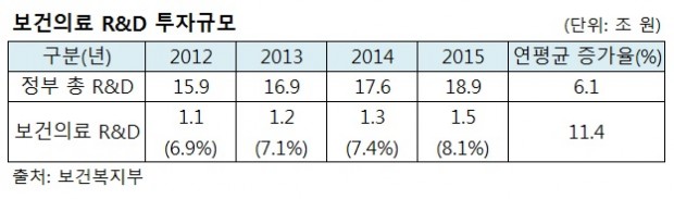 화장품을 포함한 복지부의 보건의료 R&D 투자액은 매년 증가 추세에 있다. 연평균 증가율 9.9%를 기록하며 정부 전체 R&D 예산 대비 비중 또한 지속적으로 확대됐다. 특히 복지부(28.1%), 미래부(37.7%), 산업부(16.2%) 등 3개 부처의 R&D 투자액은 전체 보건의료 연구개발 투자액의 약 80%를 차지한다.