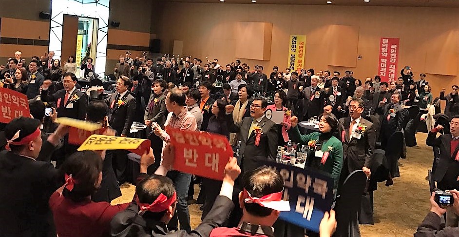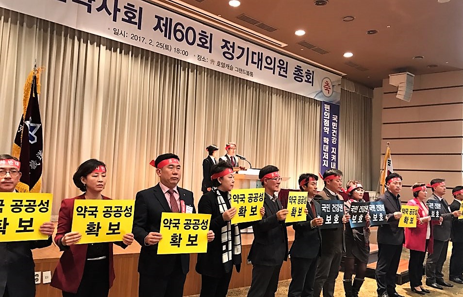 경기도약사회는 25일 수원시 호텔캐슬 그랜드볼룸서 열린 '제60회 정기대의원 총회'서 총회에 앞서 안전상비약 반대 결의문을 낭독하고, '정부는 편의점 안전상비약 확대를 즉각 중단하라'는 구호를 외쳤다.
