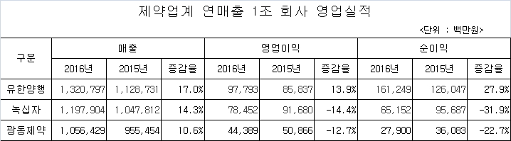 매출 1조원 이상인 3개제약사중 유한양행만 외형과 내실 모두 균형있는 성장을 한 것으로 분석됐다. 영업이익과 순이익은 2015년 대비 각각 13.9%와 27.9% 늘어난 978억과 1,612억원을 기록했다.