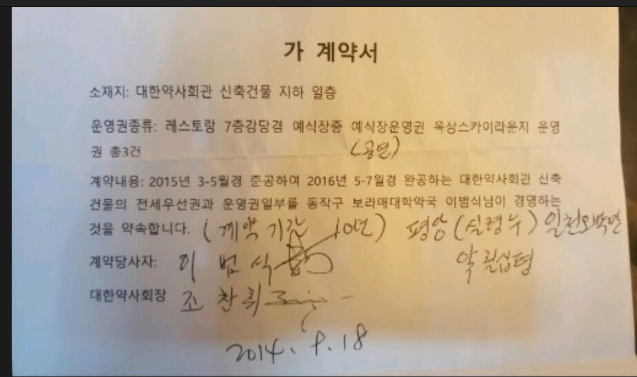 또, '2015년 3~5월경 준공해 2016년 5~7월경 완공하는 대한약사회 건물의 전세우선권과 운영권 일부를 동작구 보라매대학약국 이범식님이 경영한다는 것을 약속합니다'라는 계약 내용이 담겨 있다.