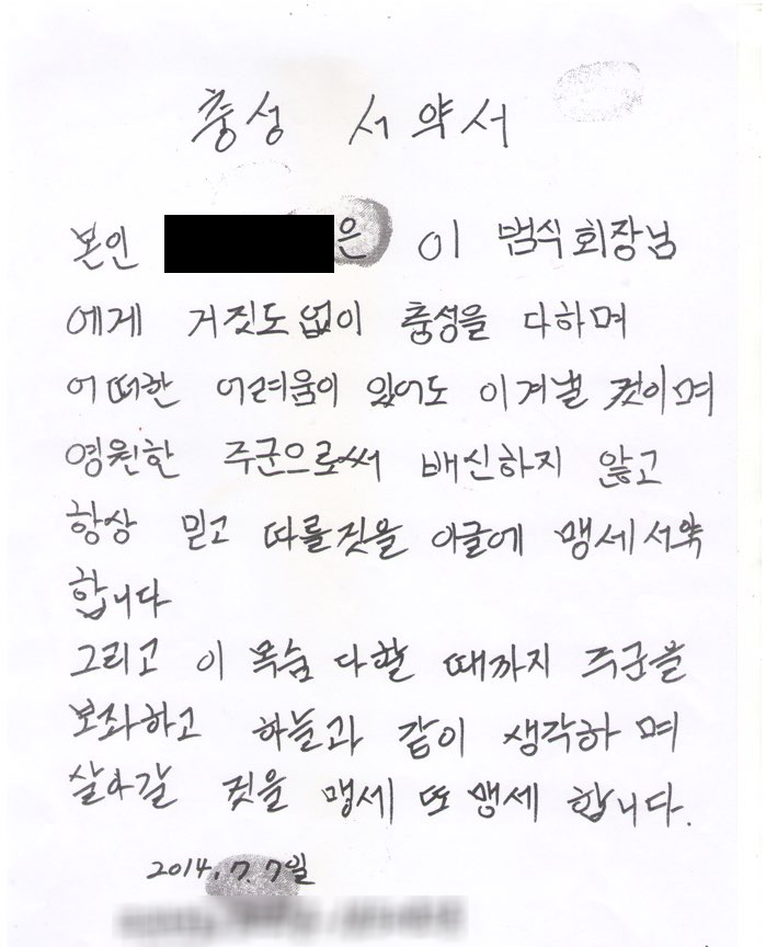 또한, 이번 사건을 제보한 김 모씨와 이범식 전동작구약사회장 간의 편지와 계약서를 비롯, 자필로 쓴 충성 서약서 등을 공개했다.