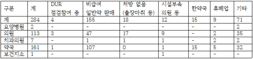 가장 높은 DUR 미점검 사유로 155개소가 '비급여, 일반약 판매'를 꼽았다.