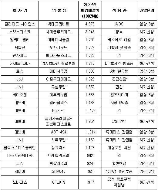 ▉ 막바지 단계 파이프라인 ‘톱 20’ 잠재적 블록버스터 드럭 리스트