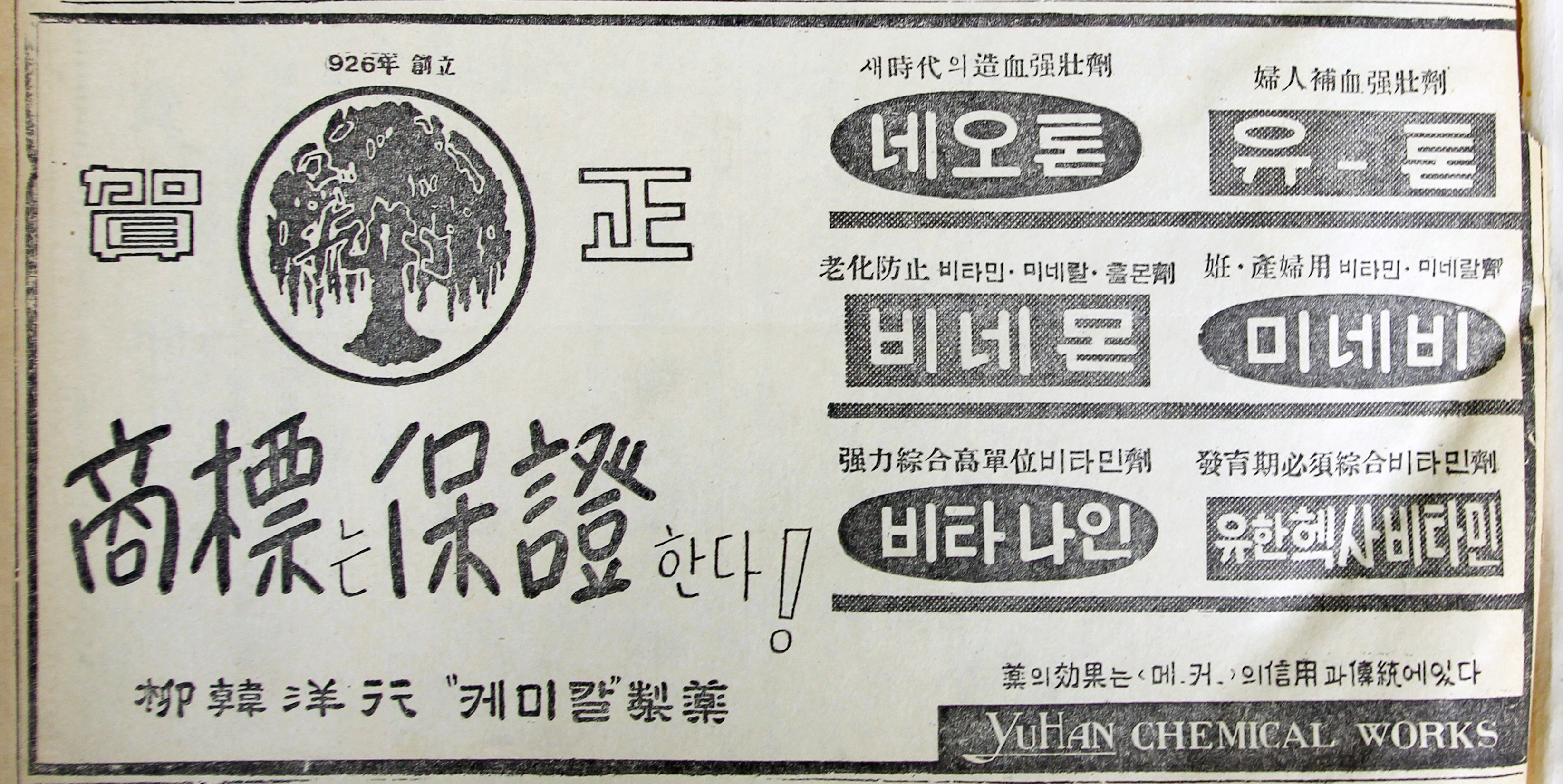 유한양행 제품종합 광고. 1960년 초반 약업신문을 비롯한 전문지와 일간지 하단 광고면에 자주 등장하는 유한양행 광고의 일반적인 형태이다.  상표는 품질을 보증한다는  문구를 통해 버들표 유한양행을 소비자들에게 어필하고 있다. 당시 유한양행은 이런형태의 광고방식을 도입해 개별제품에 대한 광고와 함께 기업이미지 제고 등 일석이조의 효과를 도모했다.