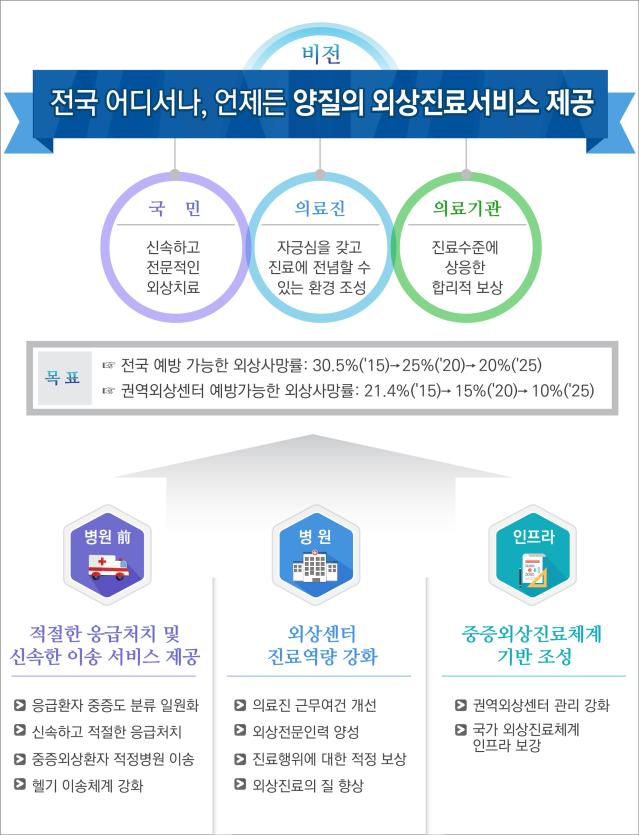 정부는 이번 대책의 차질없는 추진을 통해 예방 가능한 외상사망률을 2025년까지 현재의 2/3 수준(2015년 30.5%→2025년 20%)으로, 권역외상센터의 경우 절반 수준(2015년 21.4%→2025년 10%)으로 낮추도록 노력할 계획이다.