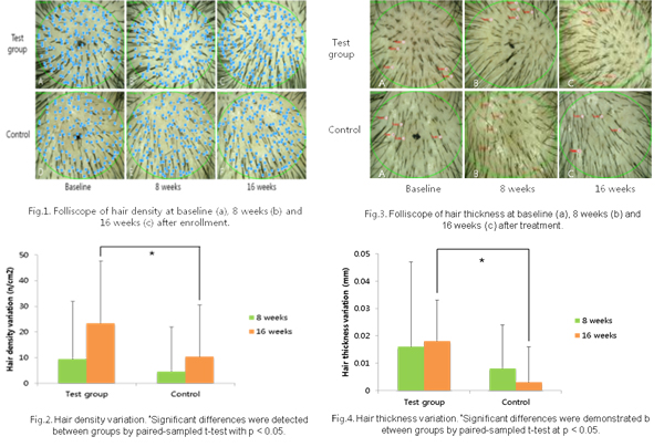 인체적용시험 연구에 있어서는 MK-R7 복합물을 1일 2회 1캡슐(200mg/day)씩 16주간 섭취해, 투약 8주, 16주 후 모발밀도의 변화량과 모발 굵기의 변화량을 측정하여 MK-R7 복합물이 탈모증상 및 모발건강에 임상적 우위성을 평가했다.