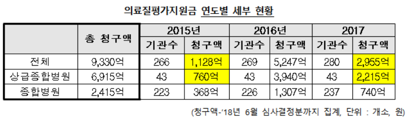 8일 정의당 윤소하 의원이 보건복지부로부터 제출받은 자료를 분석한 결과, 지난 2년4개월 간 의료기관이 청구한 의료질평가지원금은 총 9,330억 원에 달했고 그 중 74.1%에 해당하는 6,915억 원이 43개 상급종합병원에 집중된 것으로 나타났다.