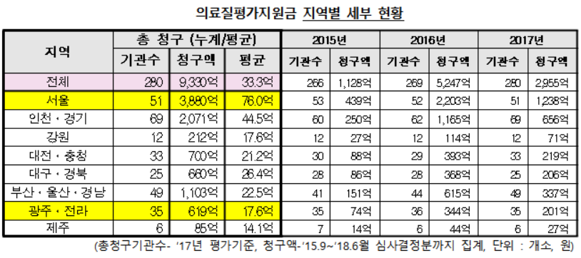 광주∙전라지역의 경우 기관 당 17억6천만 원으로 서울 소재 병원보다 58억4천만 원 적게 지원 받는 것으로 나타났다. 소재 병원 지역별 지원편차는 결국 의료서비스의 격차로 나타나게 된다.