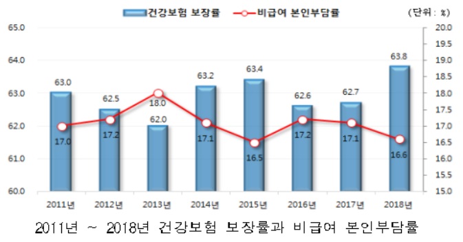 지난해 건보 보장률이 63.8%로 1.1%P 상승한 것으로 나타났다.