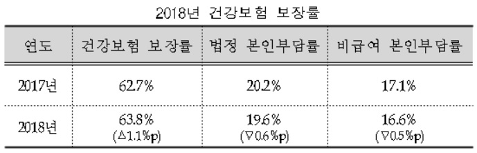 연구 결과, 2018년 건강보험 보장률은 63.8%로 전년대비 1.1%p 증가했고, 특히 중증질환 중심 보장성 강화정책의 효과로 종합병원급 이상의 보장률이 크게 개선됐다(△2.7%p).