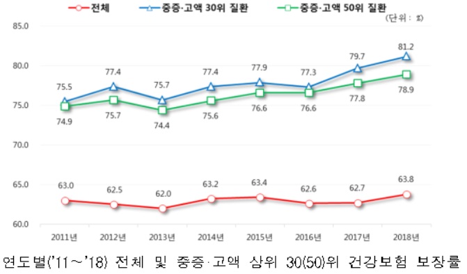 1인당 중증·고액진료비 상위 30위 내 질환 보장률은 81.2%(△1.5%p), 상위 50위 내 질환 보장률은 78.9%(△1.1%p)로 꾸준한 증가 추세를 보였다.