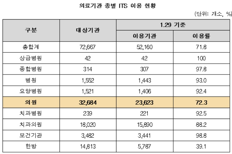 현재 대한민국의 전체 의료기관 7만 2,667개 중 가장 많은 비중을 차지하고 있는 의원급 병원(45%)의 경우 ITS를 이용하고 있는 비율은 72.3%로 다른 의료기관들과 비교했을 때 가장 낮은 것으로 나타났다.(한방 제외)