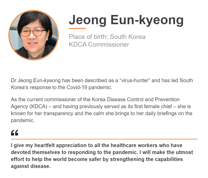 지난 23일 영국 BBC 방송이 공개한 '올해의 여성 100인'에는 정은경 질병관리청장이 포함돼 있었다.