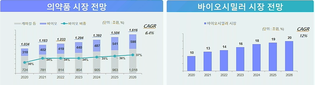 이상준 수석 부사장은 “2021년 의약품 시장 규모는 1,183조원으로 2026년에는 1,616조원으로, 연평균 6.4% 성장을 예상하고 있다”며 “이 중 바이오 의약품이 차지하는 비중은 2021년 34% 에서 2026년에는 37%에 해당할 것으로 기대되고 있다”고 말했다.