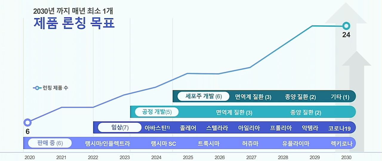 그와 더불어 임상 중인 제품으로 ▲아바스틴 ▲졸레어 ▲스텔라라 ▲아일리아 ▲프롤리아 ▲악템라 ▲코로나19 관련 제품 등 7가지가 있다.