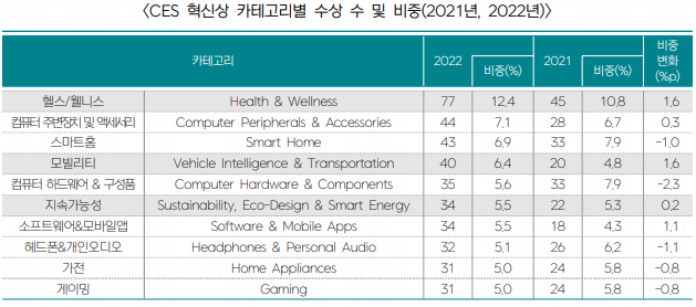혁신상 카테고리별 수상 수 및 비중을 살펴보면, 헬스&웰니스 분야는 2021년 45개가 선정돼 10.7% 비중을 차지하는 것으로 나타났으며, 2022년에는 77개가 선정돼 12.4% 비중을 차지했고, 전년대비 1.6%p 증가세를 보였다.