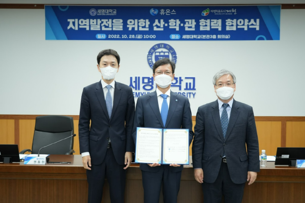 휴온스그룹이 제천시·세명대학교와 지역 발전을 위한 손을 맞잡았다.