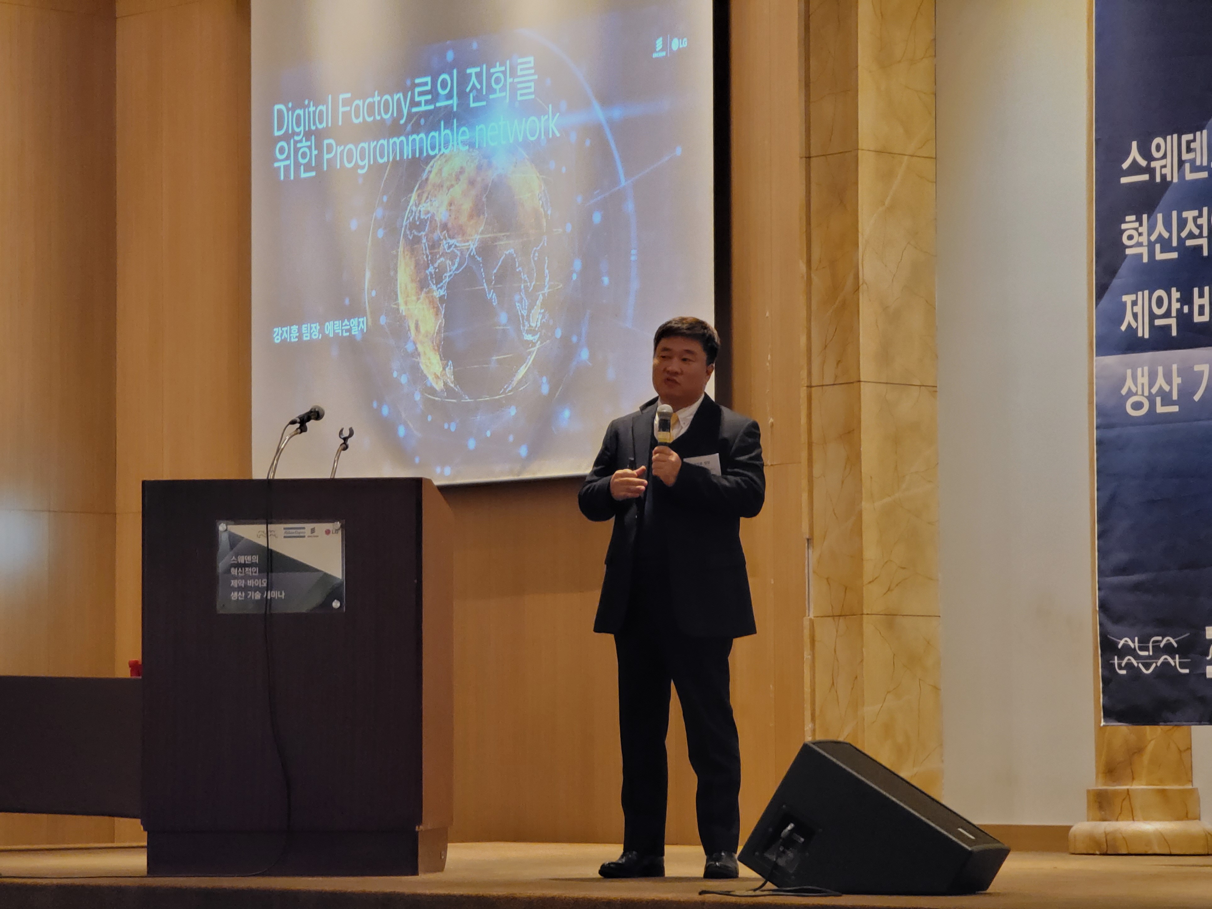 강지훈 에릭슨엘지 팀장은 'DIGITAL FACTORY로의 진화를 위한 PROGRAMMABLE NETWORK: WHY PRIVATE 5G'를 주제로 제약바이오 제조소의 디지털 혁신에 대해 발표했다.