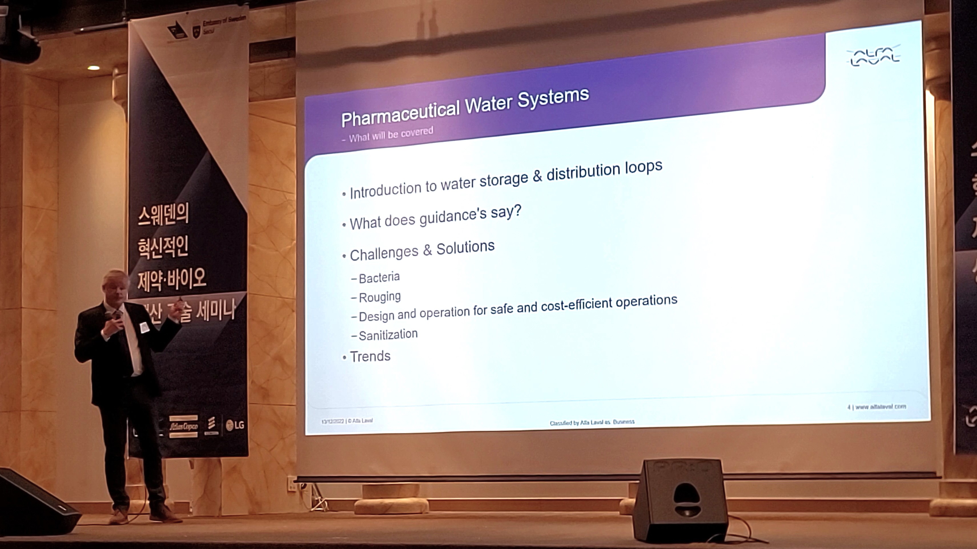 그는 “유럽연합에서 의약품 제조용수 관리 기준이 담긴 GMP Annex1을 발표하고 내년 8월 25일부터 시행한다고 밝혔다"며 "보다 엄격한 워터시스템을 유지해야 유럽 수출을 할 수 있게 됐고, 또 강화되는 ESG 기준도 맞춰야 한다. 알파라발은 이렇게 강화되는 품질관리 기준과 ESG 기준을 모두 충족할 수 있는 솔루션을 제공할 수 있도록 끊임없이 함께 고민할 것”이라고 밝혔다.