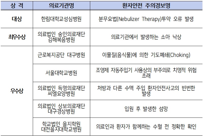 특별상을 포함한 공모전에 대한 세부결과는 4일 환자안전 보고학습시스템 포털에서 확인할 수 있으며, 수상작은 환자안전사고의 예방 및 재발방지대책 수립·공유를 위해 정보제공지로 제작해 게시할 예정이다.