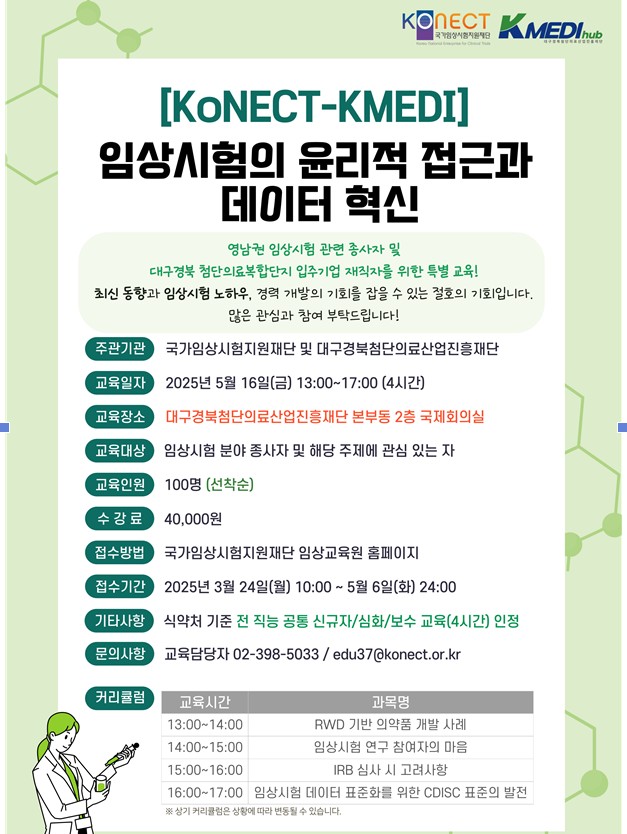 국가임상시험지원재단(이사장 박인석, 이하 ‘재단’)과 대구경북첨단의료산업진흥재단(이사장 박구선)이 5월 16일 대구에서 임상시험의 윤리성과 데이터 활용 역량을 갖춘 실무 인재 양성을 위해 ‘임상시험 윤리적 접근과 데이터 혁신’ 교육과정을 진행한다. 이번 교육은 영남권 임상시험 종사자를 위한 맞춤형 실무 교육으로 마련됐다.