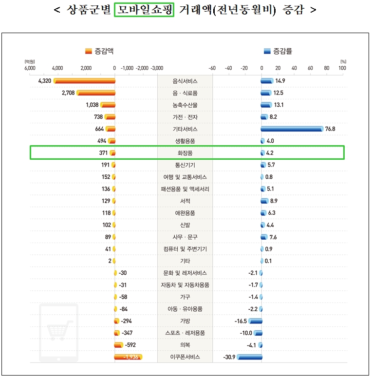 ▲ 2025년 3월 모바일쇼핑 상품군별 거래액 증감표. 화장품은 전년 동월 대비 거래액이 4.2% 증가했다. ⓒ통계청