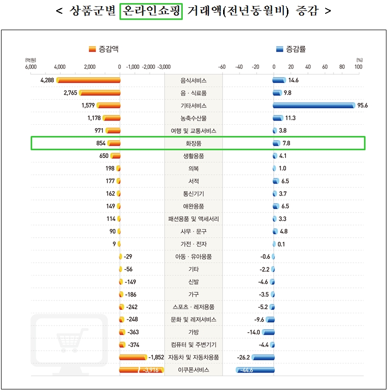 ▲ 2025년 3월 온라인쇼핑 상품군별 거래액 증감표. 화장품은 전년 동월 대비 거래액이 7.8% 증가했다. ⓒ통계청
