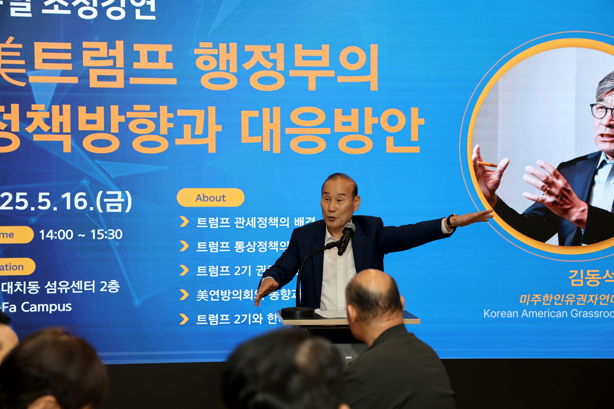 김동석 대표는 한미 정치 및 통상 분야에서 30여 년간 활동해 온 현장 전문가로, 특히 미국 의회와 행정부의 정책 결정구조 및 통상정책 이슈에 정통한 인물이다. 이날 강연에서는 트럼프 2기 행정부의 통상정책 기조와 핵심 인물 성향, 미 연방의회의 정책 방향, 그리고 한미 관계의 재편 가능성 등을 핵심 주제로 통찰력 있는 분석을 제시했다.