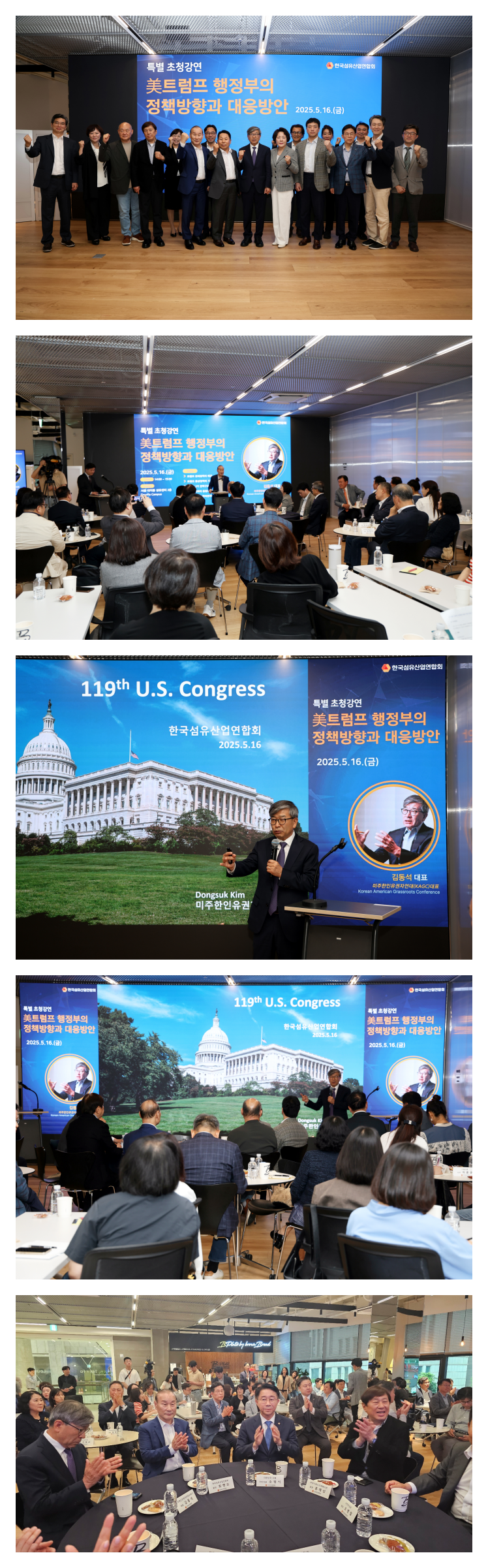 한국섬유산업연합회(회장 최병오, 이하 섬산련)는 5월 16일(금), 섬유센터 2층 텍스파(Tex+Fa) 캠퍼스 라운지에서 미주한인유권자연대(KAGC) 김동석 대표를 초청, “美 트럼프 행정부의 정책방향과 대응방안”을 주제로 특별 강연을 개최하였다.