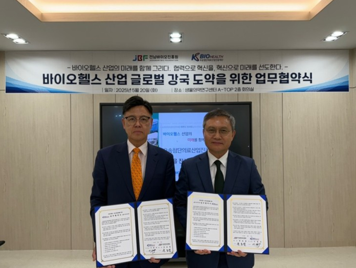 (왼쪽부터) KBIOHealth 이명수 이사장, 전남바이오진흥원 윤호열 원장.©KBIOHealth KBIOHealth(오송첨단의료산업진흥재단·이사장 이명수)는 20일 전남바이오진흥원(원장 윤호열)과 바이오헬스산업의 활성화 및 상호 협력 강화를 위한 업무협약(MOU)을 체결했다고 20일 밝혔다.