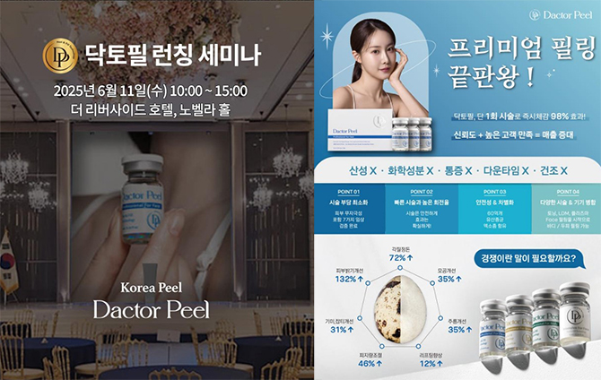 ㈜닥터제이코스(대표 김효정)는 오는 6월 11일 오전 10시부터 오후 3시까지, 서울 강남구 소재 더 리버사이드 호텔 노벨라 홀 로비 1층에서 ‘2025 닥토필 론칭 세미나’를 개최한다고 26일 밝혔다. 이번 세미나는 클리닉 및 에스테틱살롱 원장을 대상으로 한 전문 세미나로, 필링 분야의 혁신을 알리는 장이 될 전망이다.