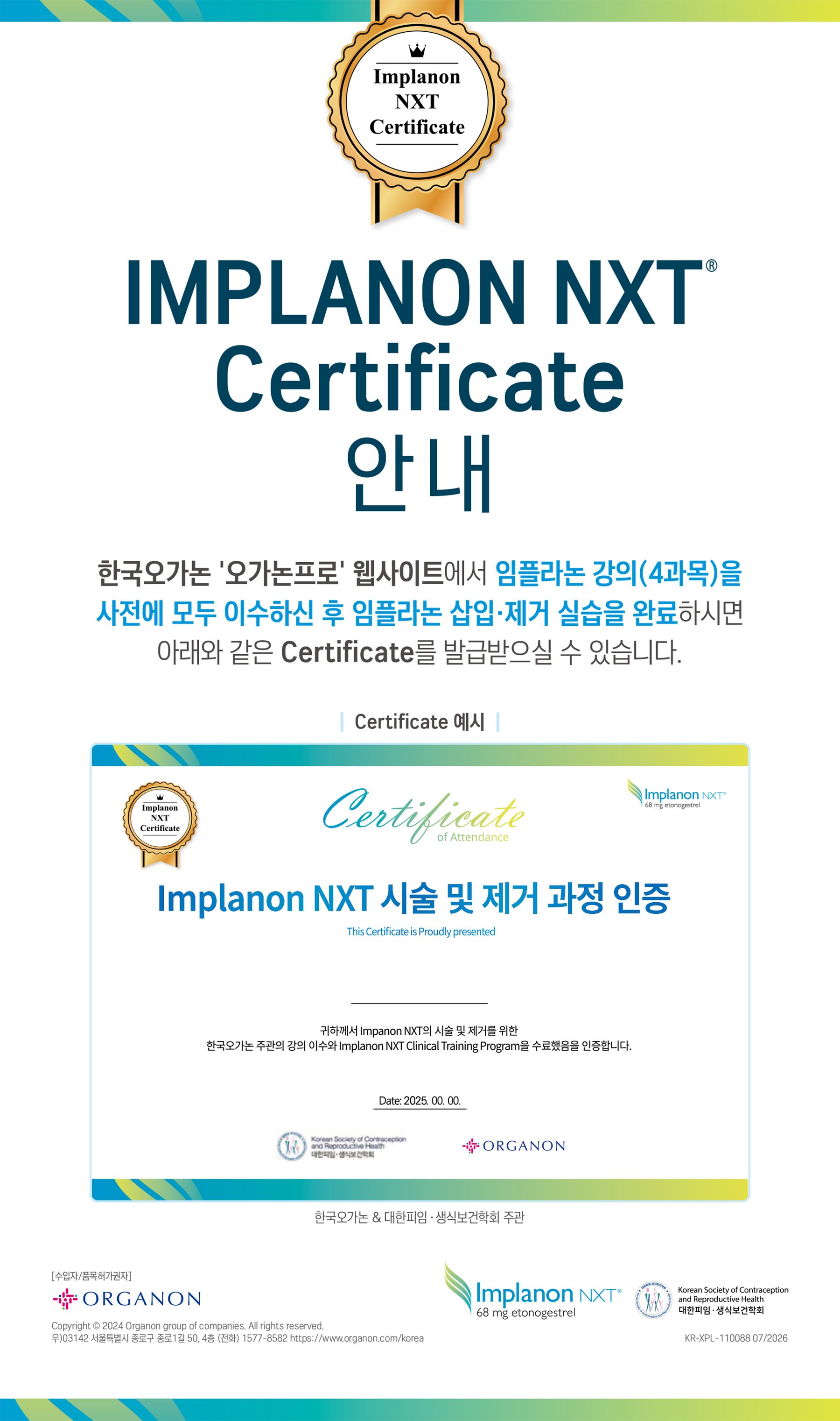 한국오가논은 이러한 기준에 맞춰, 의료진 교육과 인증을 연계한 시술 인증제를 2024년부터 시행 중이다. 인증을 원하는 의료진은 의료전문가 포털인 ‘오가논프로(Organon Pro)’에서 △제품 개요 △삽입 시술 △제거 및 교체 △환자 상담 등 총 4과목을 수강한 후, 한국오가논에서 주최하는 임플라논 삽입·제거 실습에 참여하는 과정을 거친다. 이후 실습 확인서를 제출하면, 대한피임·생식보건학회에서 ‘임플라논 시술 인증서’를 발급한다.