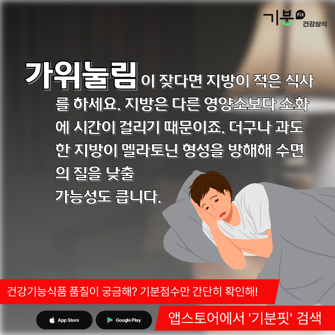 그 때문에 저녁 늦은 시간에 지방이 많은 음식을 먹으면 수면을 방해할 수 있고 수면의 질이 떨어진다.