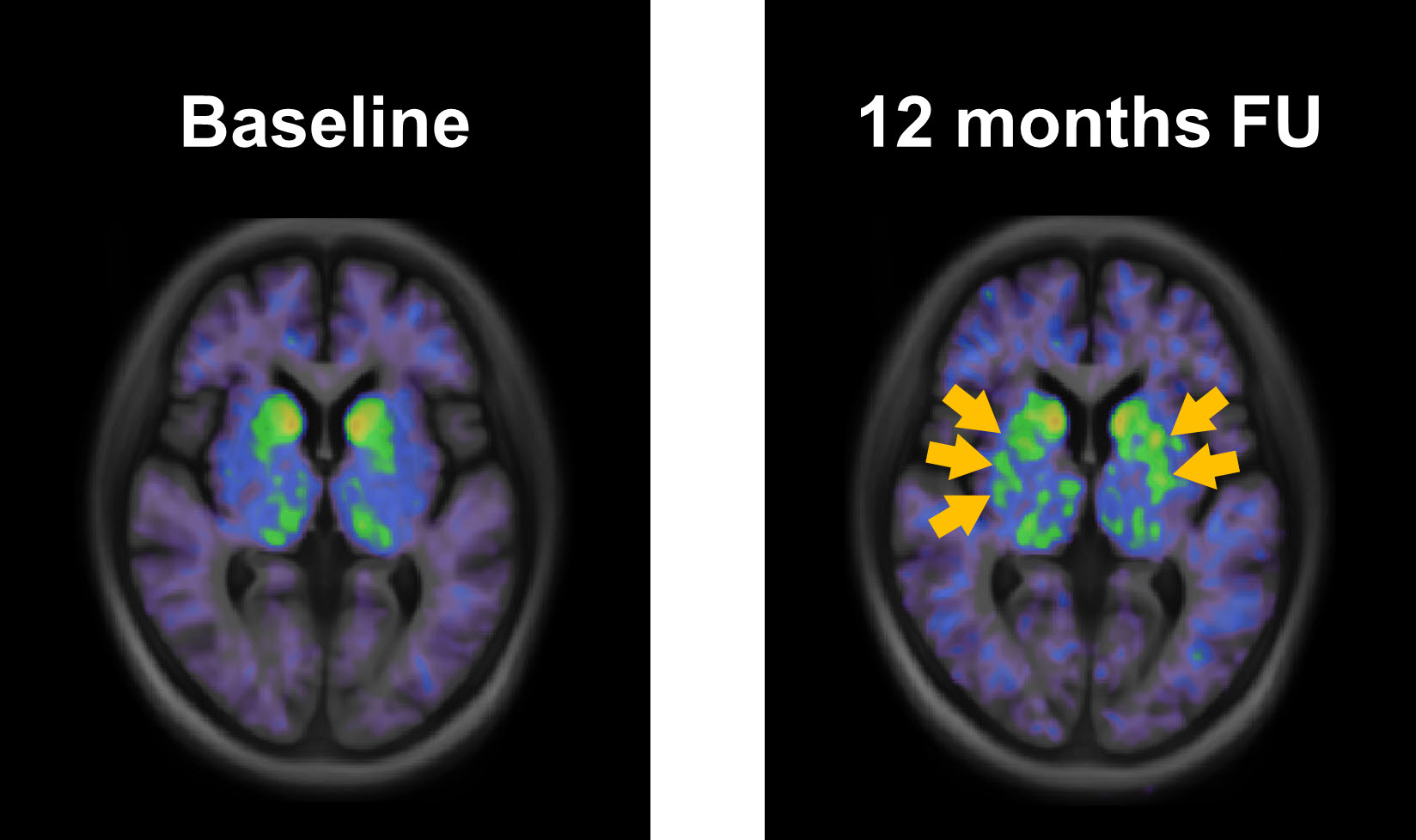 이식 1년 후 시행한 도파민 뇌영상 (FP-CIT-PET)에서 이식된 도파민 신경세포 생착을 시사하는 신호 증가 소견이 관찰됐으며, 이는 저용량군보다 고용량군에서 두드러졌다.