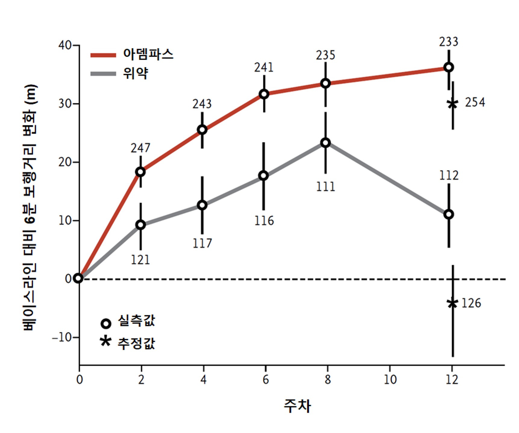 아뎀파스의 임상적 효능과 안전성 프로파일은 PATENT 연구를 통해서도 확인됐다. PATENT-1 연구에서는 아뎀파스 투여군이 위약군에 비해 6분 보행거리(6MWD)에서 유의미한 운동능력 개선을 보였다. 아뎀파스 투여군에서는 베이스라인 대비 30m 증가한 반면, 위약군은 6m 감소하여 두 치료군 간 총 36m의 차이를 보였다.