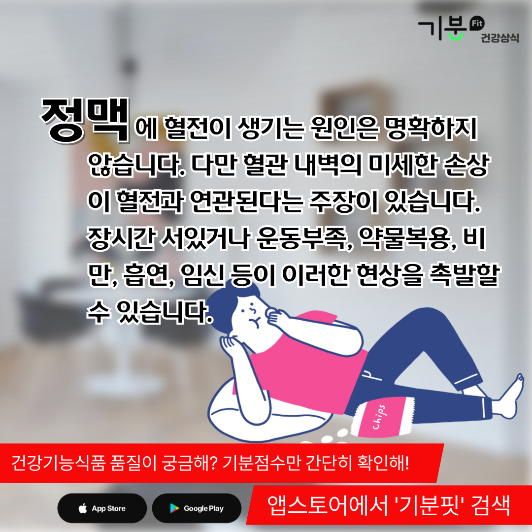 감염이 있거나 장시간 서 있는 경우, 운동 부족, 약물 복용, 비만, 흡연, 임신 등이 위험을 높이는 요소다.