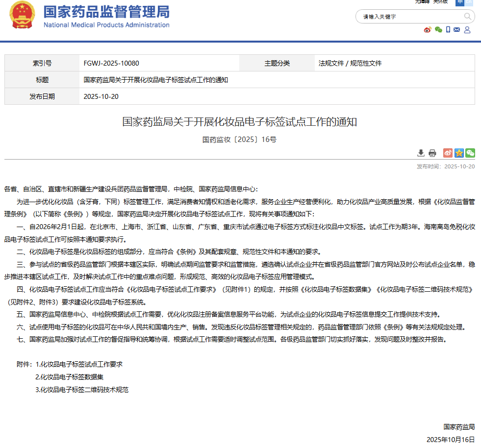중국이 화장품 표시 제도의 디지털 전환을 본격화한다. 중국 국가약품감독관리국(NMPA)은 내년 2월 1일부터 베이징, 상하이, 저장, 산둥, 광둥, 충칭 등 6개 지역에서 화장품의 중국어 라벨을 전자 방식으로 표시하는 시범사업을 시작한다. NMPA는 이같은 내용을 담은 ‘화장품 전자라벨 시범사업 통지문(2025년 16호)’을 지난 20일 발표했다. 시범 기간은 3년이며, 하이난의 면세 화장품도 동일 기준으로 적용받을 수 있다.