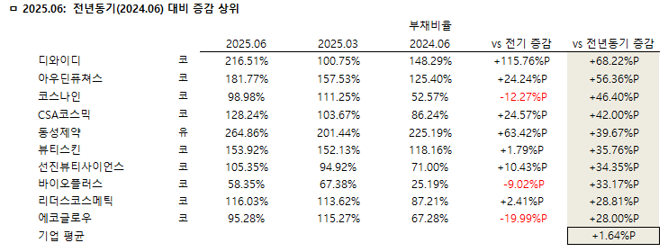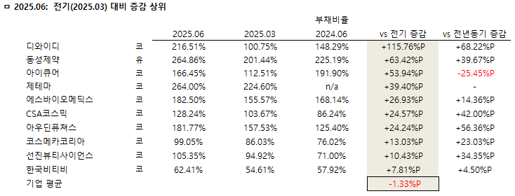 ◇ 2025년 상반기 부채비율 전년동기 대비 증가 상위 10개사