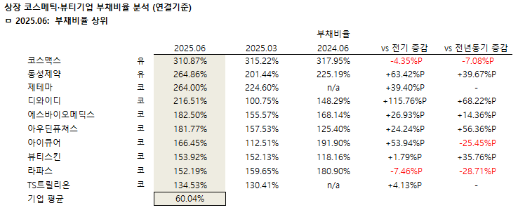 이어 에스바이오메딕스(26.93%p), CSA코스믹(24.57%p), 아우딘퓨쳐스(24.24%p), 코스메카코리아(13.03%p), 선진뷰티사이언스(10.43%), 한국비티비(7.81%p)도 전기 대비 부채비율 상승폭이 큰 편이다. 상장 화장품 기업 89개사의2025년 상반기 부채비율 평균은 전기 대비 1.33%p 낮아졌다.